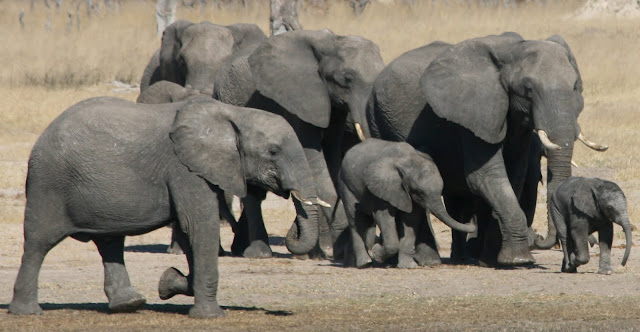 At 5:10 PM, a large herd of elephants came down to the camp watering hole and graciously provided us with several Kodak moments. Lighting was a little tricky, but hopefully Photoshop will help with that.